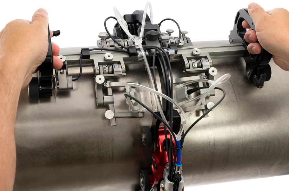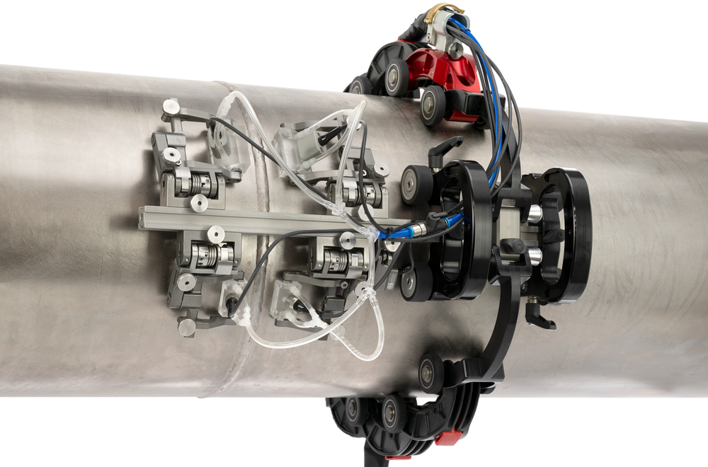 链节可以轻松扫查直径为126 - 965 mm的管道。把他们扣在一起就可以完成,按下按钮即可解锁 |