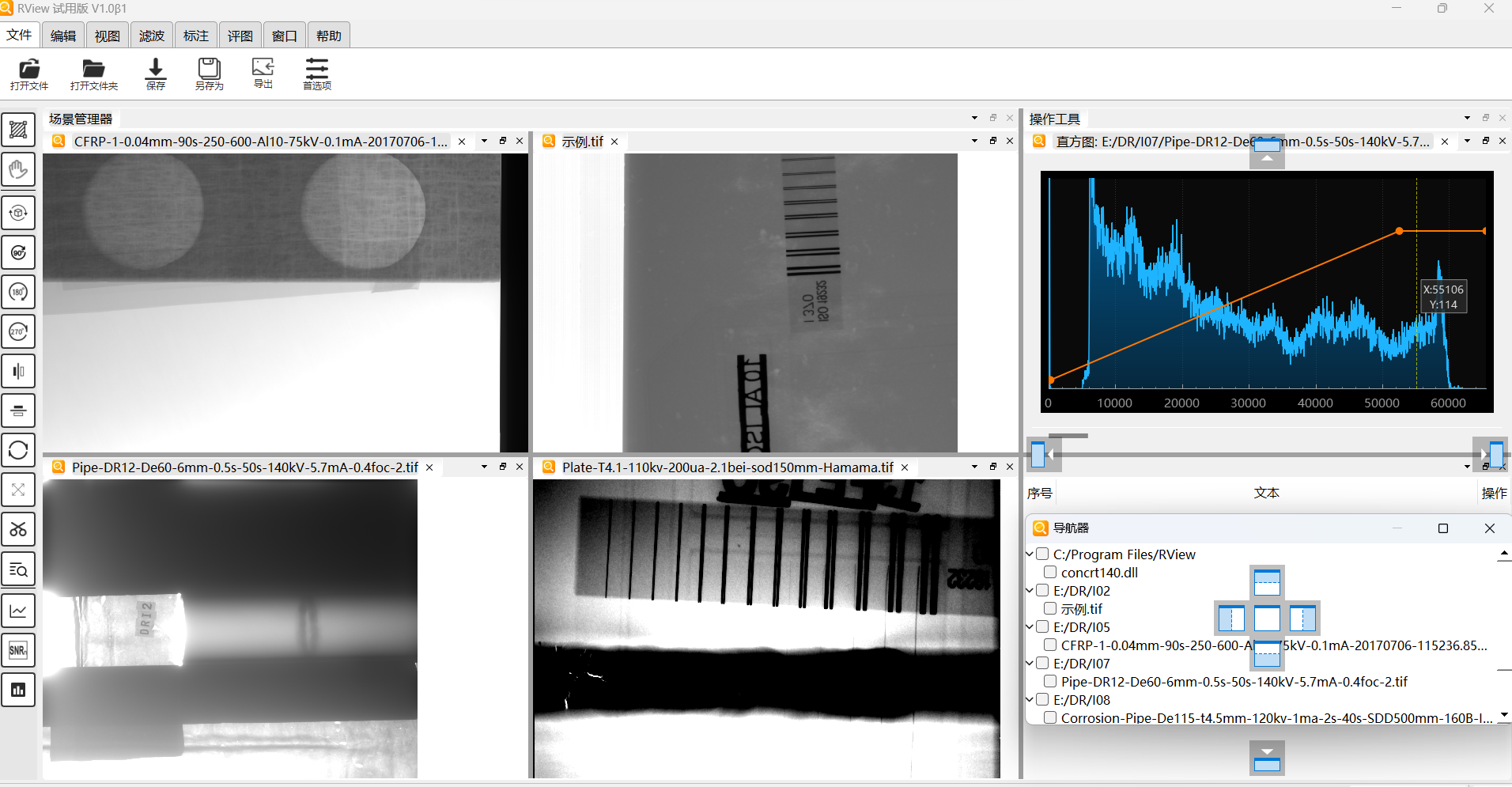 RView是一款自主研发的射线图像分析软件,它提供了一套完整的工具链,包括图像标注、精确测量以及图像处理等功能,能够满足科研和工业检测等多个领域的需求。 RView为无损检测领域提供了强大的技术支持,帮助用户高效、准确地完成检测任务。 全自主研发,接口开放,支持二次开发 界面简单直接,符合国人操作习惯 功能全面,满足日常射线评图使用 基础版免费试用,为无损检测的提供便利便利平台 工具包(高级版)针对特殊应用的强力工具。 |
