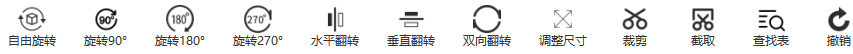 提供图像的几何操作相关功能,包括“ 自由旋转” 、“旋转90° ”、 “旋转180°”“旋转270°”“水平翻转 ”“垂直翻转 ”、 “调整尺寸” 、“裁剪 ”以及“查找表”、“截取”、“撤销”等基本功能,用户在调整图像大小时,可自主选择是否维持宽高比,确保图像不失真。